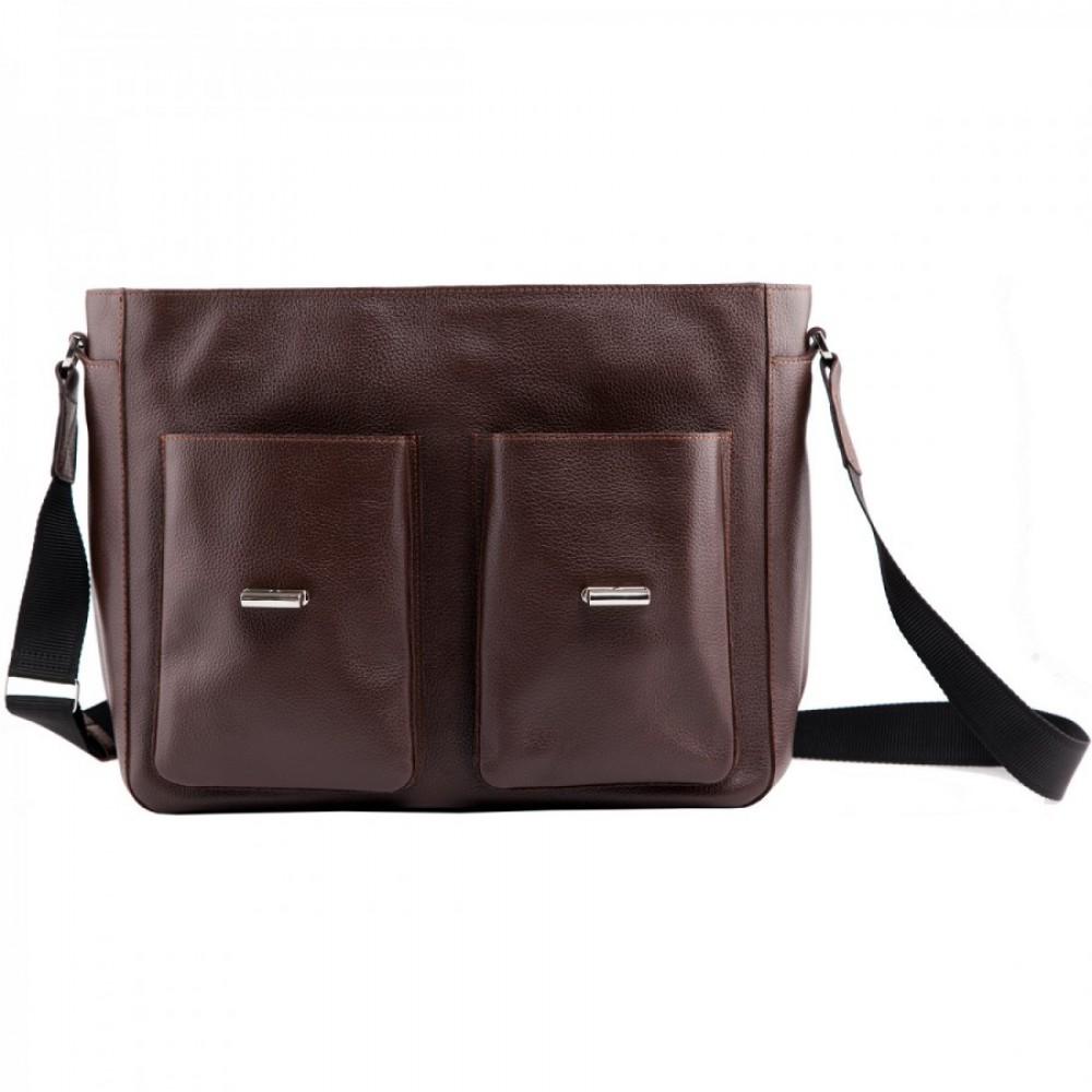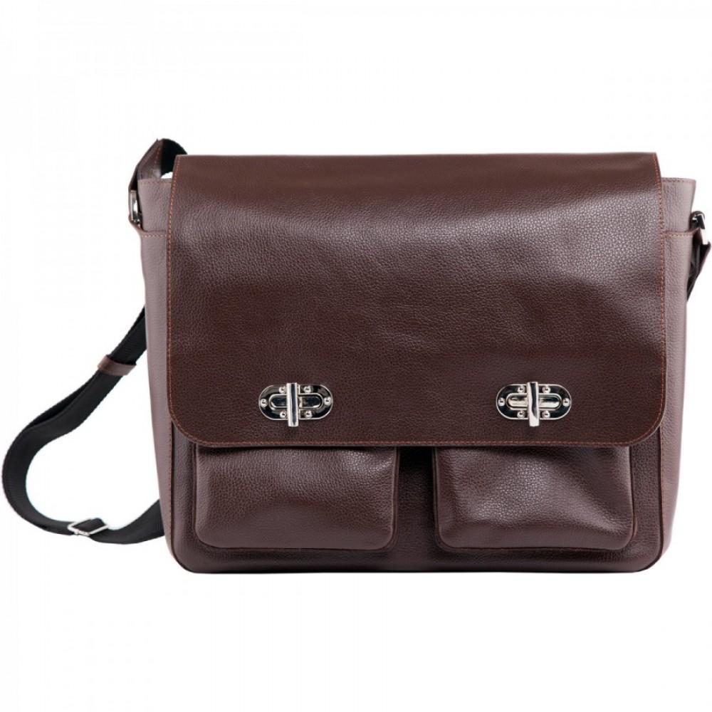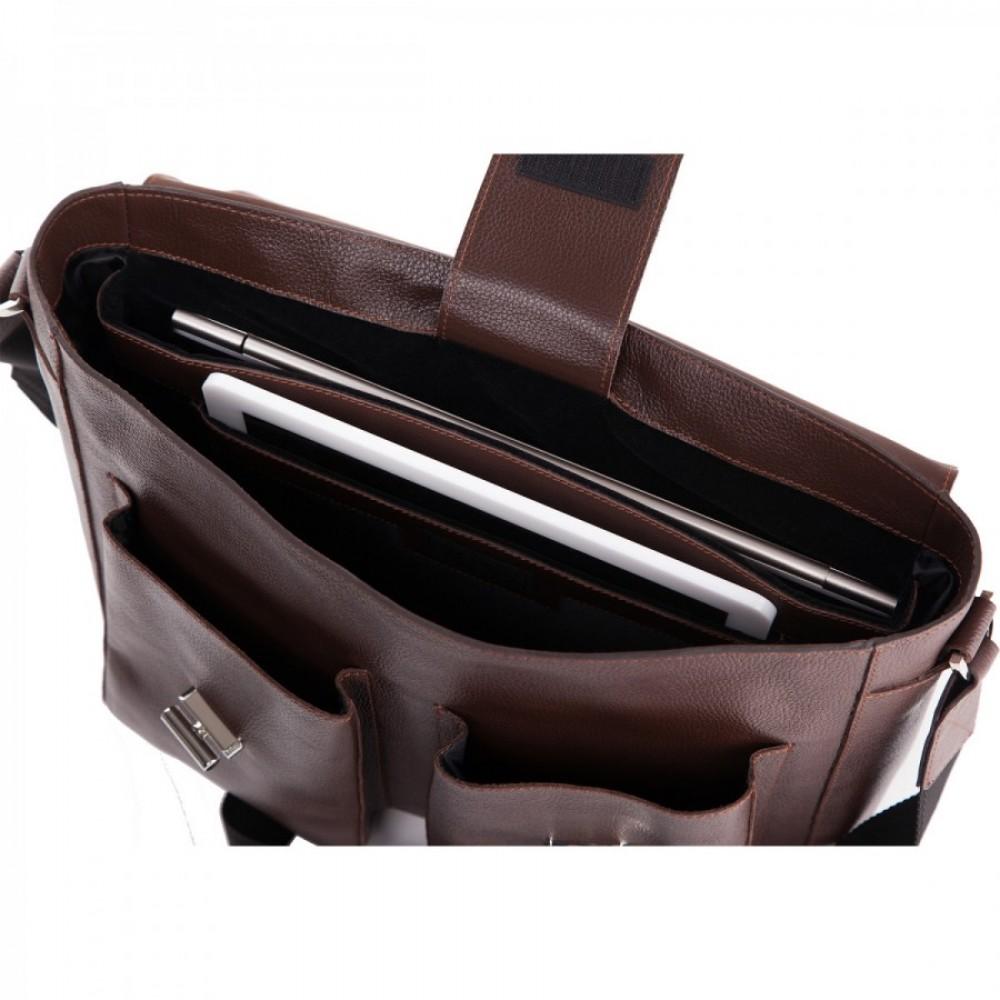 Безупречной выделки гладкая кожа в коричнево-коньячных тонах обладает богатой фактурой и воплощает в себе наиболее выигрышное цветовое решение. Внутреннее усиленное отделение для портативного компьютера обеспечит его гарантированную защиту, а множество, как внешних, так и внутренних карманов разместят в себе канцелярские принадлежности и бизнес-атрибутику. Плечевой ремень с кожаной накладкой обуславливают достойный уровень комфорта при ношении изделия.